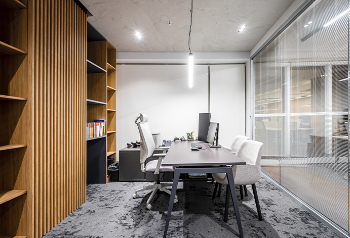 O cuidado está nos detalhes: integração entre madeira e tons neutros para transmitir solidez e elegância, iluminação pensada para valorizar o espaço e reduzir fadiga visual, além de layout inteligente que otimiza circulação e organização.