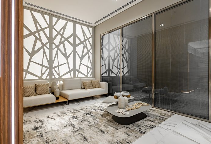 Neste projeto assinado pela arquiteta Adriana Paiva, o painel orgânico traz identidade, enquanto a paleta neutra e as texturas sofisticadas criam uma atmosfera acolhedora e contemporânea. O mobiliário de linhas limpas e a mesa de centro marcante reforçam o conceito moderno, sem abrir mão do conforto.